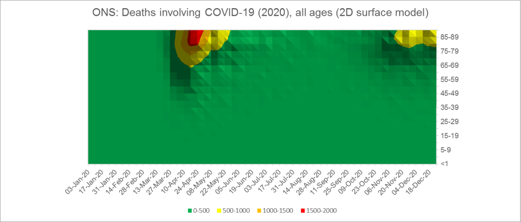 For deaths involving COVID-19 between the age of zero and sixty-four, 7,918 death registrations were made during 2020. That compares to 69,768 death registrations for the same year for the over sixty-fives. As demonstrated by the attached surface models, this is very much a disease that is significantly more likely to affect the elderly population than those of working age.